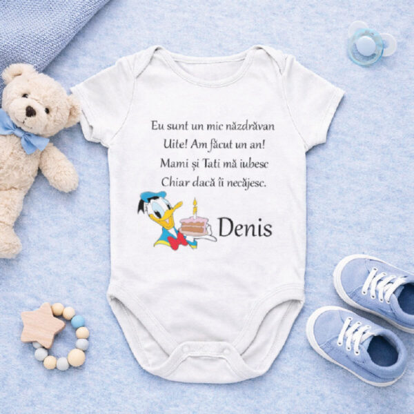 Alege și tu un Body Personalizat cu mesaj pentru petrecerea micuțului. Noi am ales un design tematic, condimentat cu personajul Donald Duck. Ție îți revine sarcina de a completa acest design cu un mesaj reprezentativ precum și  cu numele sărbătoritului.
