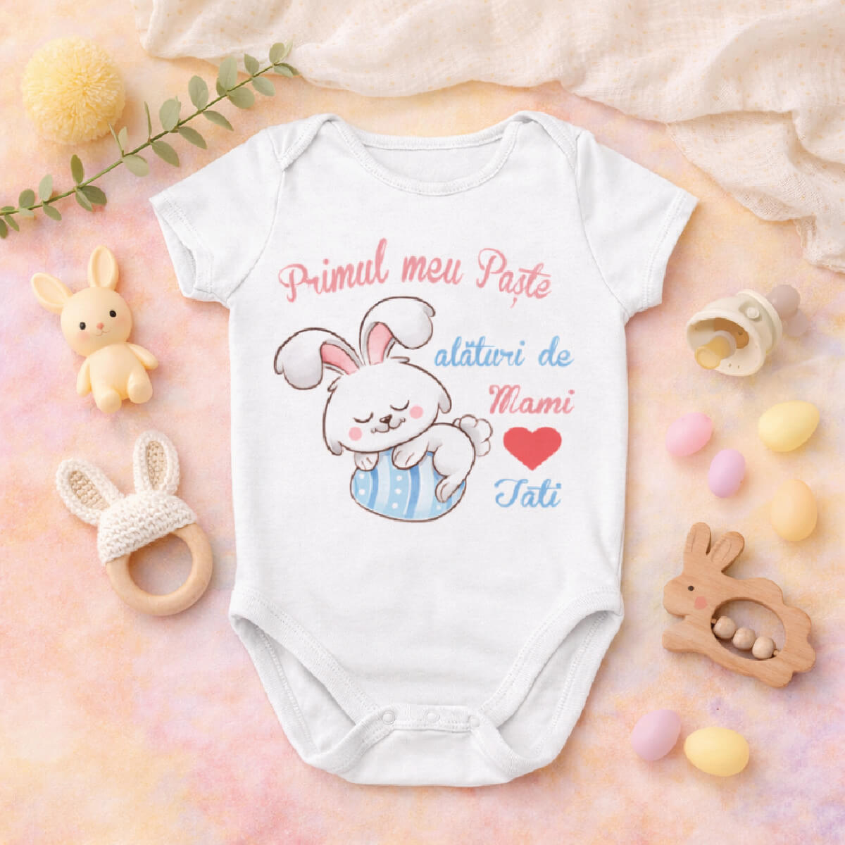 Alege un body personalizat cu mesajul Primul meu Paște alături de mami și tati și creează cele mai frumoase amintiri. Îl poți păstra sau îl poți dărui!