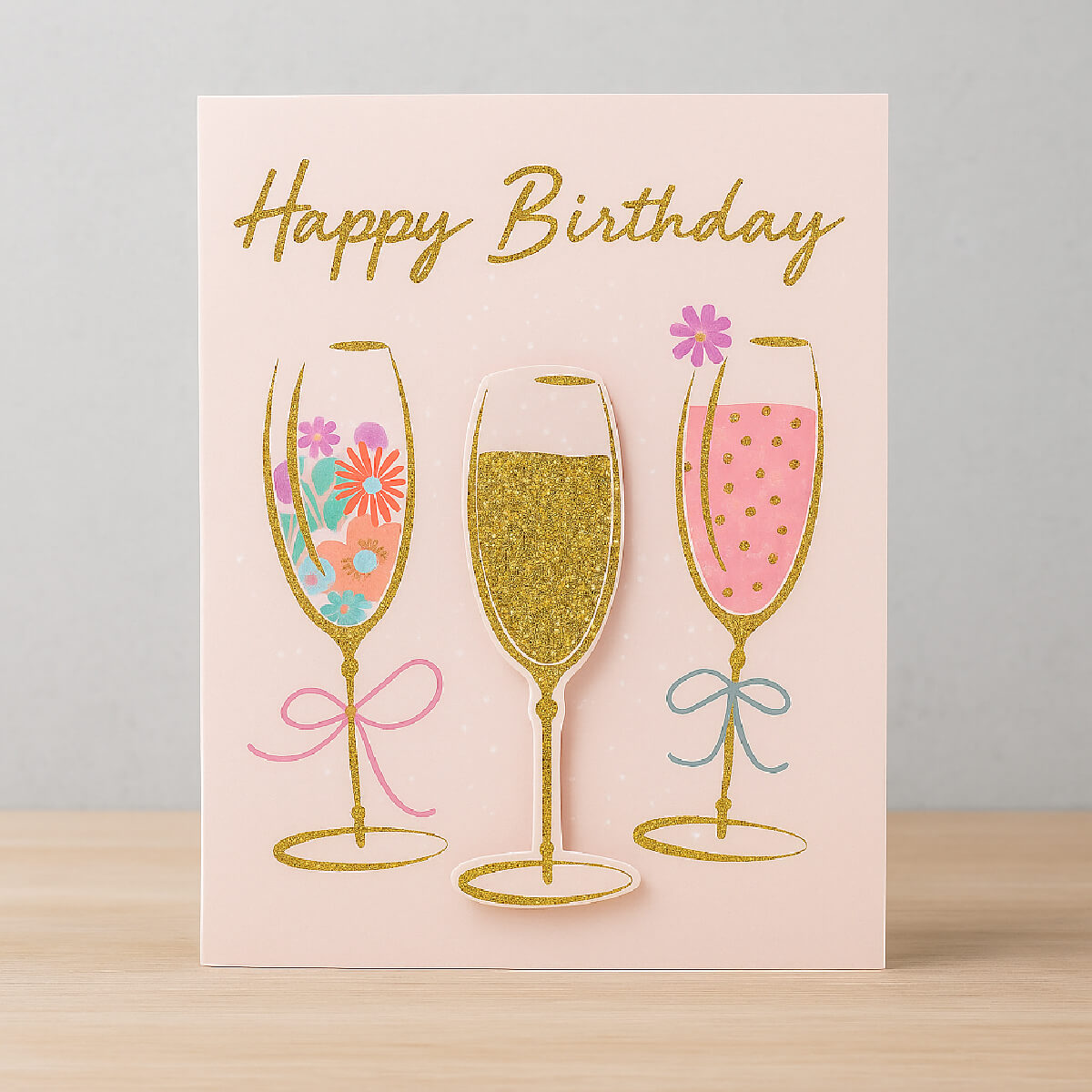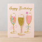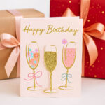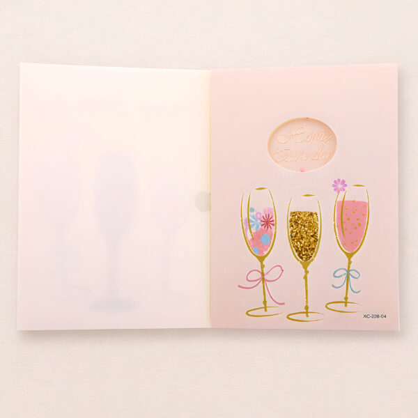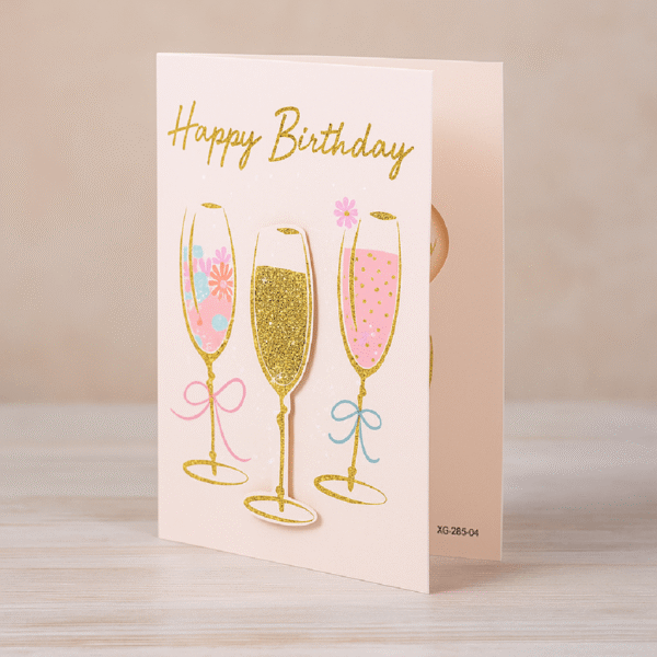 Felicitare veselă și colorată, realizată din hârtie cartonată premium, decorată cu motive aniversare (pahare de șampanie și sclipici) – perfectă pentru a aduce un zâmbet de ziua cuiva drag. Fiecare felicitare este livrată împreună cu un plic și ambalată individual în folie de protecție, fiind gata de oferit cadou.