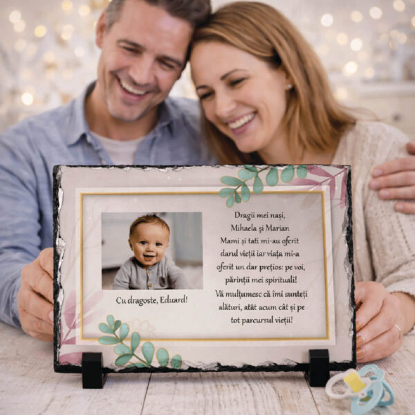 Ești în căutarea unui cadou personalizat pentru nași? Ce spui de o piatră ardezie personalizată cu o poză și un mesaj reprezentativ? Surprinde-i și tu în cel mai frumos și inedit mod. Oferă o amintire peste care timpul nu poate trece!