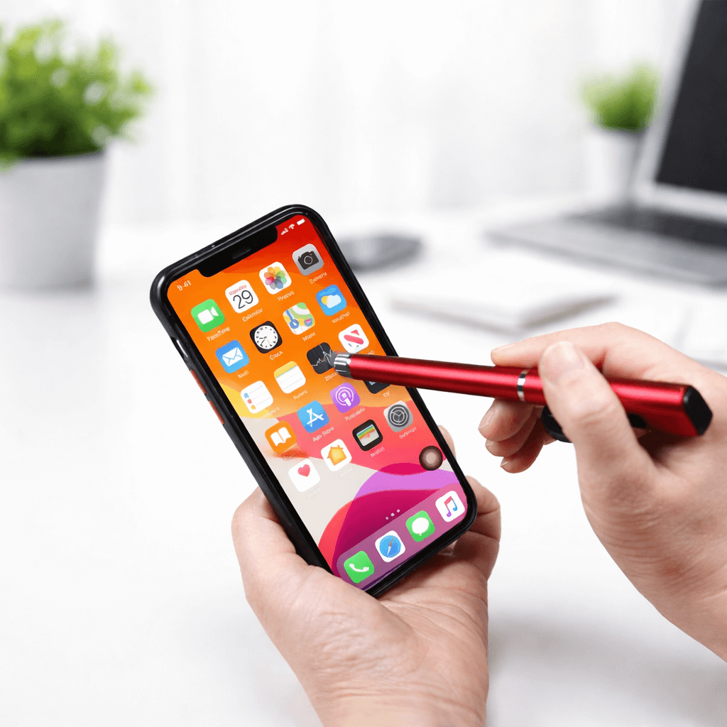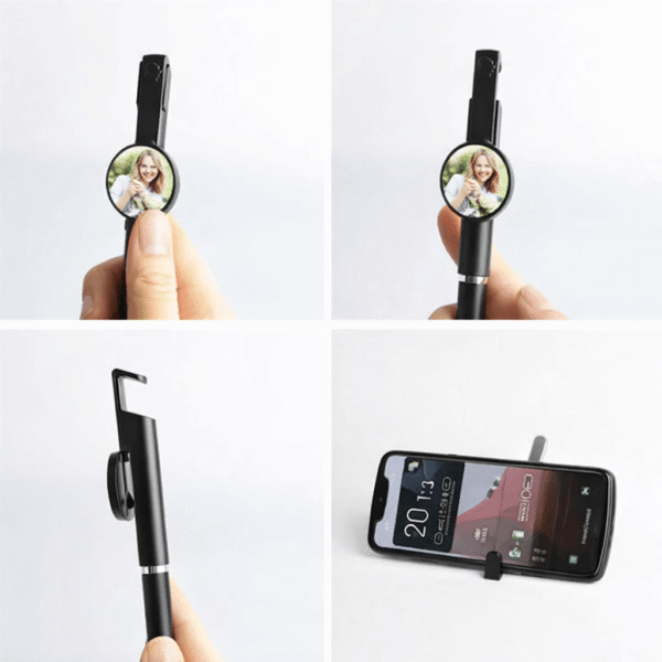 Îi vei surprinde cu siguranță pentru că nu este doar un pix care scrie bine. Dacă glisezi agățătoare pixului în sus, acesta se transformă într-un suport de telefon numai bun pentru a fi folosit la apeluri video, youtube, filme sau meeting-uri. Partea moale de la capătul pixului este un stylus pentru ecranele touchscreen. Navighezi pe telefon sau tabletă fără urme de degete.