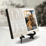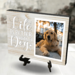 Ești în căutarea unui obiect care să îți păstreze o amintire dragă? Sau poate cauți un cadou special pentru o persoană deosebită.  Îți propunem o Plachetă Foto Personalizată cu poză și mesaj simbolic – Life is better with dog.