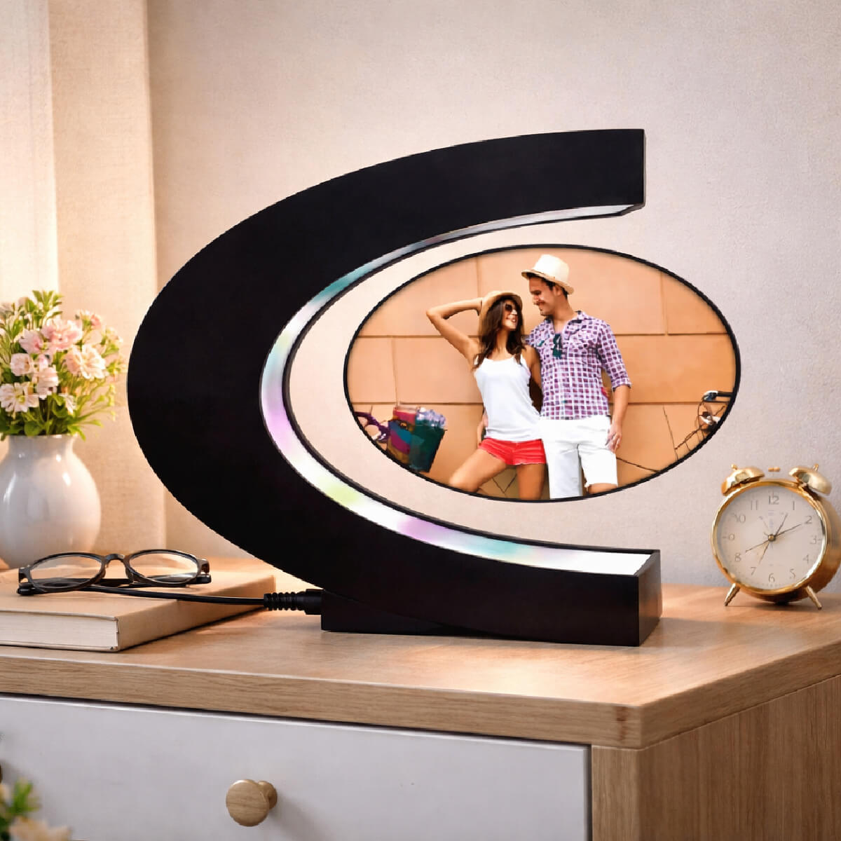 Tocmai ai descoperit cadou potrivit pentru orice ocazie: Ramă Foto Plutitoare Personalizată cu 2 poze! Poate fi dăruită prietenilor, colegilor, părinților, persoanei iubite, unui cadru didactic, nașilor iar lista poate să continue. Și totuși, ce este atât de special la această ramă? Plutește, levitează mai exact, cu o rotire perfectă de 360 de grade incluzând si lumină LED. Super, nu-i așa?
