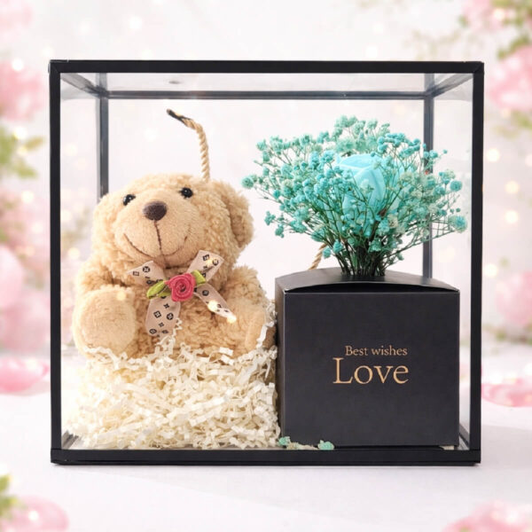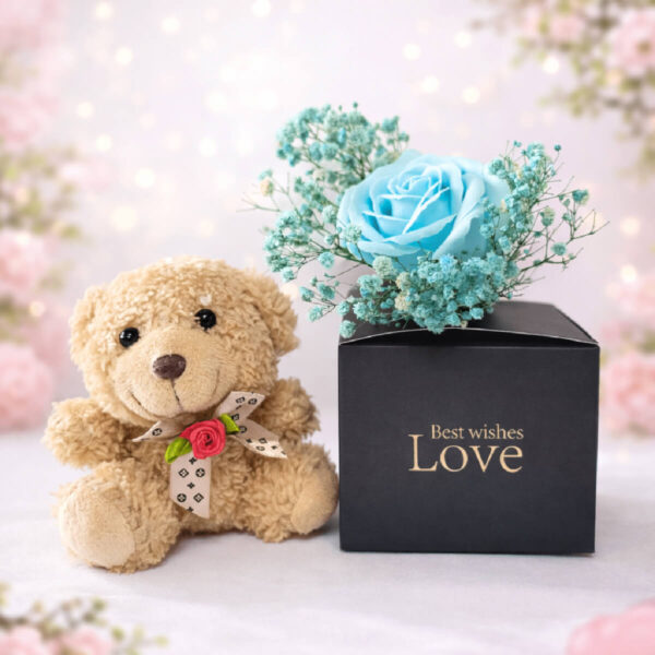 Set Cadou Aranjament Flori de săpun Albastre + Ursuleț – un cadou elegant, romantic și plin de dragoste.