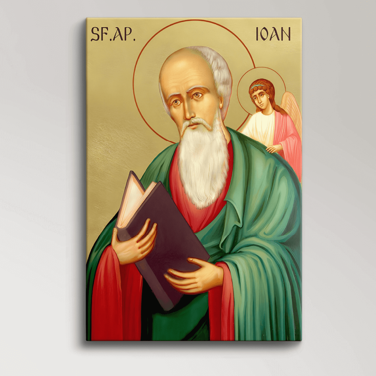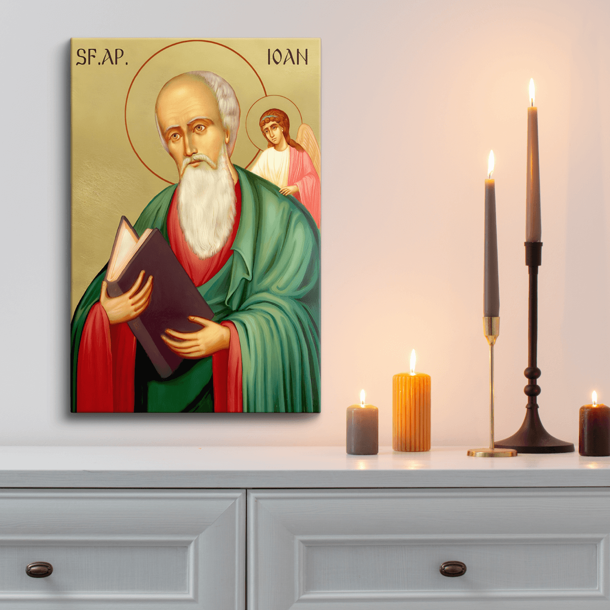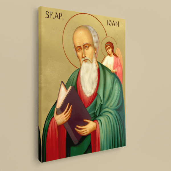 Tablou canvas cu icoana Sfântului Apostol Ioan, realizată în stil bizantin tradițional, cu detalii expresive și culori vii. Sfântul Ioan este reprezentat cu Evanghelia în mână, simbol al înțelepciunii și al cuvântului divin, împreună cu îngerul, semn al inspirației și al revelației.