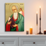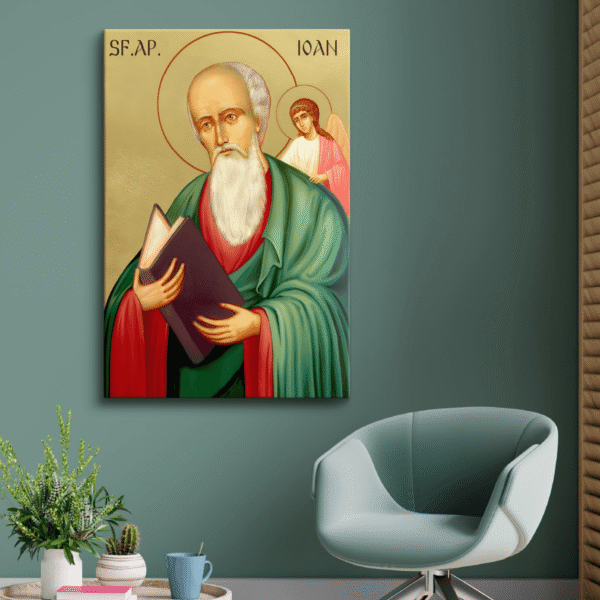 Tablou canvas cu icoana Sfântului Apostol Ioan, realizat pe pânză premium, culori vii și rezistente, întins pe șasiu din lemn. Un simbol de credință, inspirație și binecuvântare, ideal pentru casă sau ca dar de suflet.